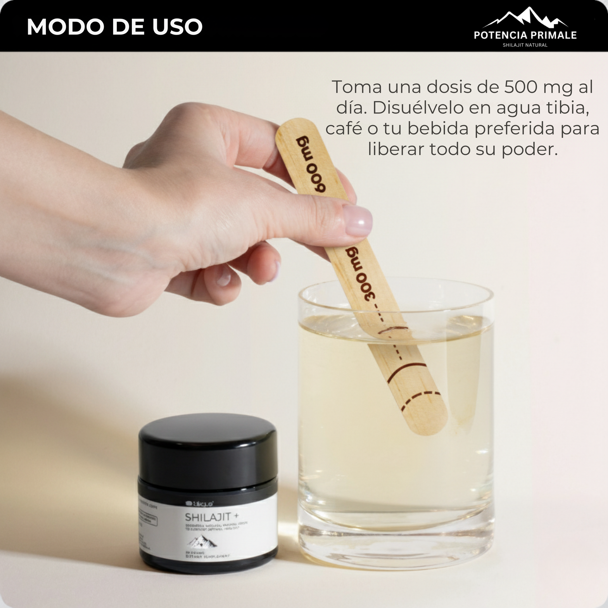 Toma una porción del tamaño de un guisante (aprox. 500 mg) de resina Potencia Primale.